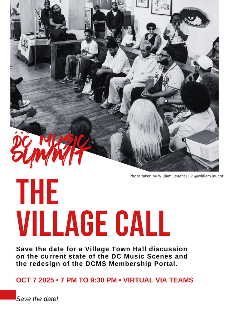 Save the date for a Village Town Hall discussion on the current state of the DC Music Scenes and the redesign of the DCMS Membership Portal.